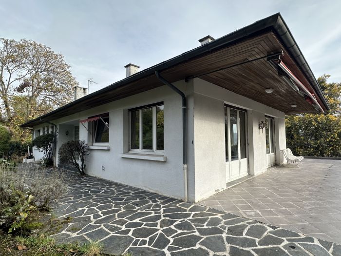 Située sur les hauteurs de la ville, cette agréable maison de plain pied vous offre une belle pièce de vie lumineuse avec insert à bois, une cuisine séparée, trois chambres côté jardin, une salle d'eau entièrement refaite et un wc séparé.