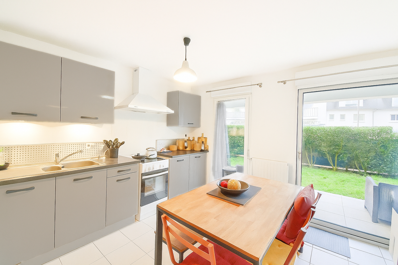 Entre Bourg et Plage, dans un environnement parfaitement au calme, cet appartement deux pièces de 45m2 est en rez de jardin.