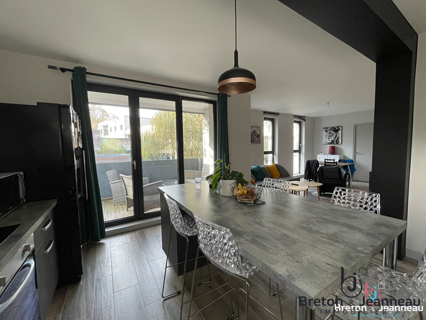 LAVAL, rive gauche, entre centre ville et gare, au dernier étage avec ascenseur, un superbe appartement d'environ 101m2 hab comprenant une entrée, une cuisine équipée ouverte sur un grand séjour-salon, 3 chambres (dont une avec douche intégrée), une salle...