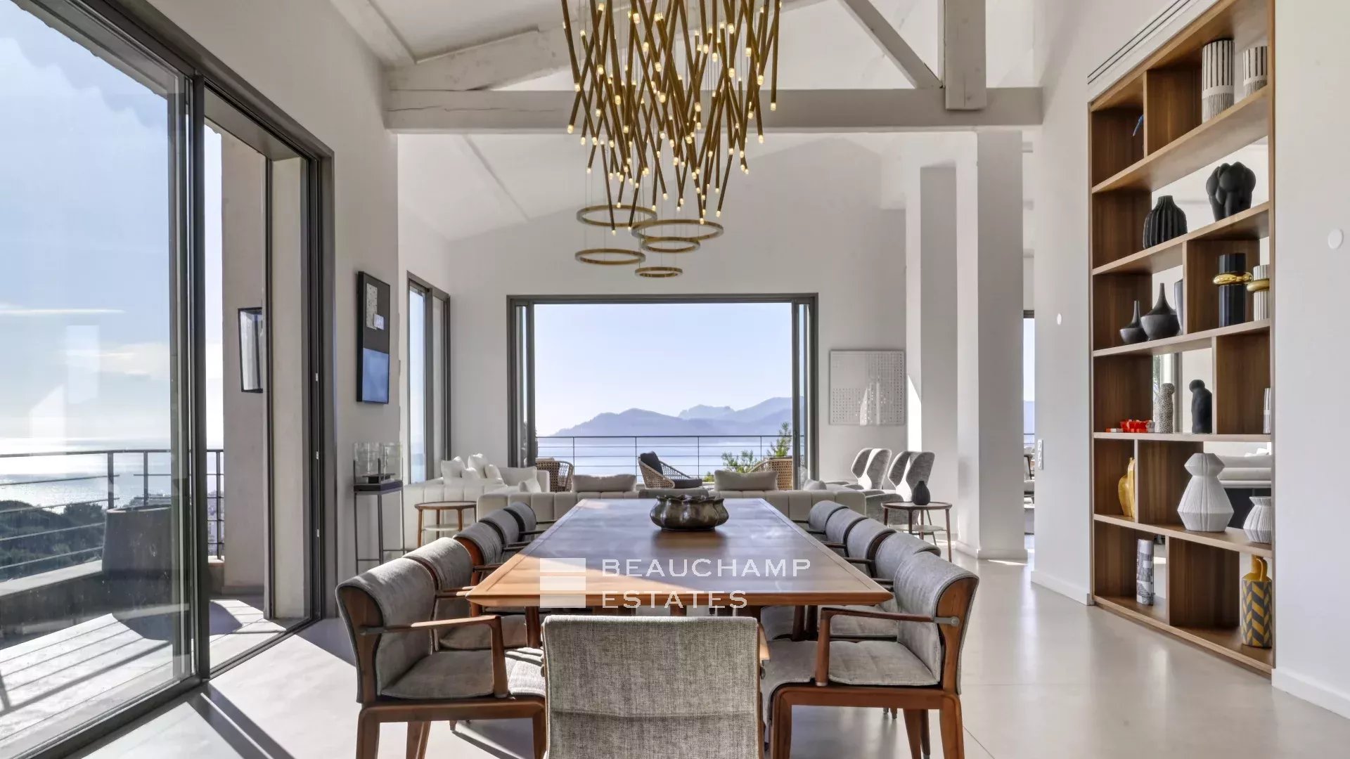Au cœur du domaine du Super Cannes, superbe villa contemporaine d'architecte d'une surface de 428m² sise sur un terrain paysager d'environ 2 500m² surplombant les îles de Lérins et le Cap d'Antibes, au calme absolu.