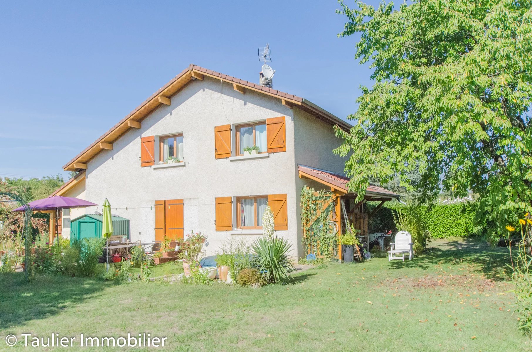 Exposée plein Sud, cette maison de 91 m² entièrement rénovée est édifiée sur une parcelle de 662 m², dont une partie est joliment arborée.