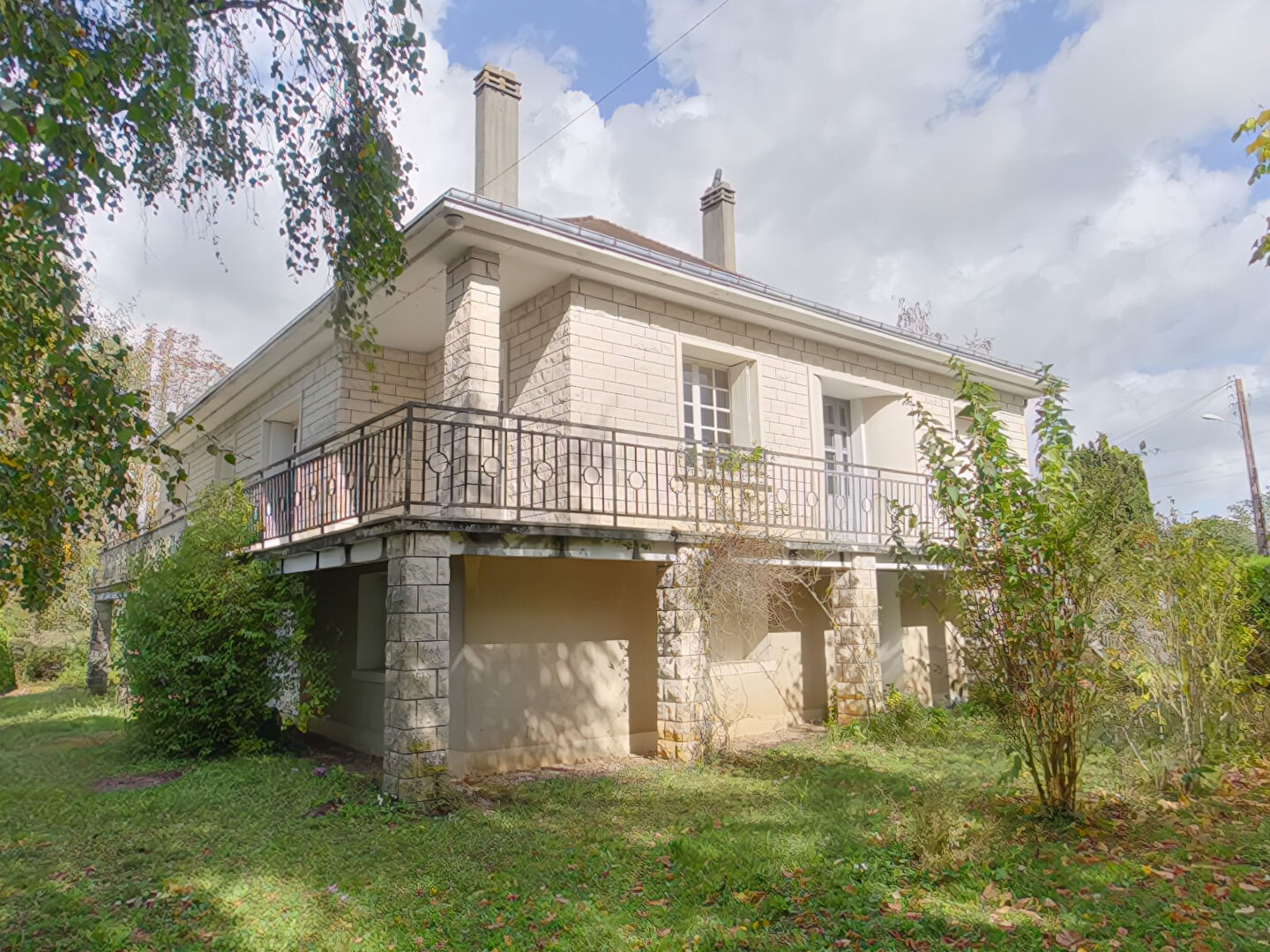 Maison en pierre de taille élevée sur sous-sol (construction 1964) avec vue dégagée, comprenant 3 logements distincts, un terrain clos et arboré, double garage.<...