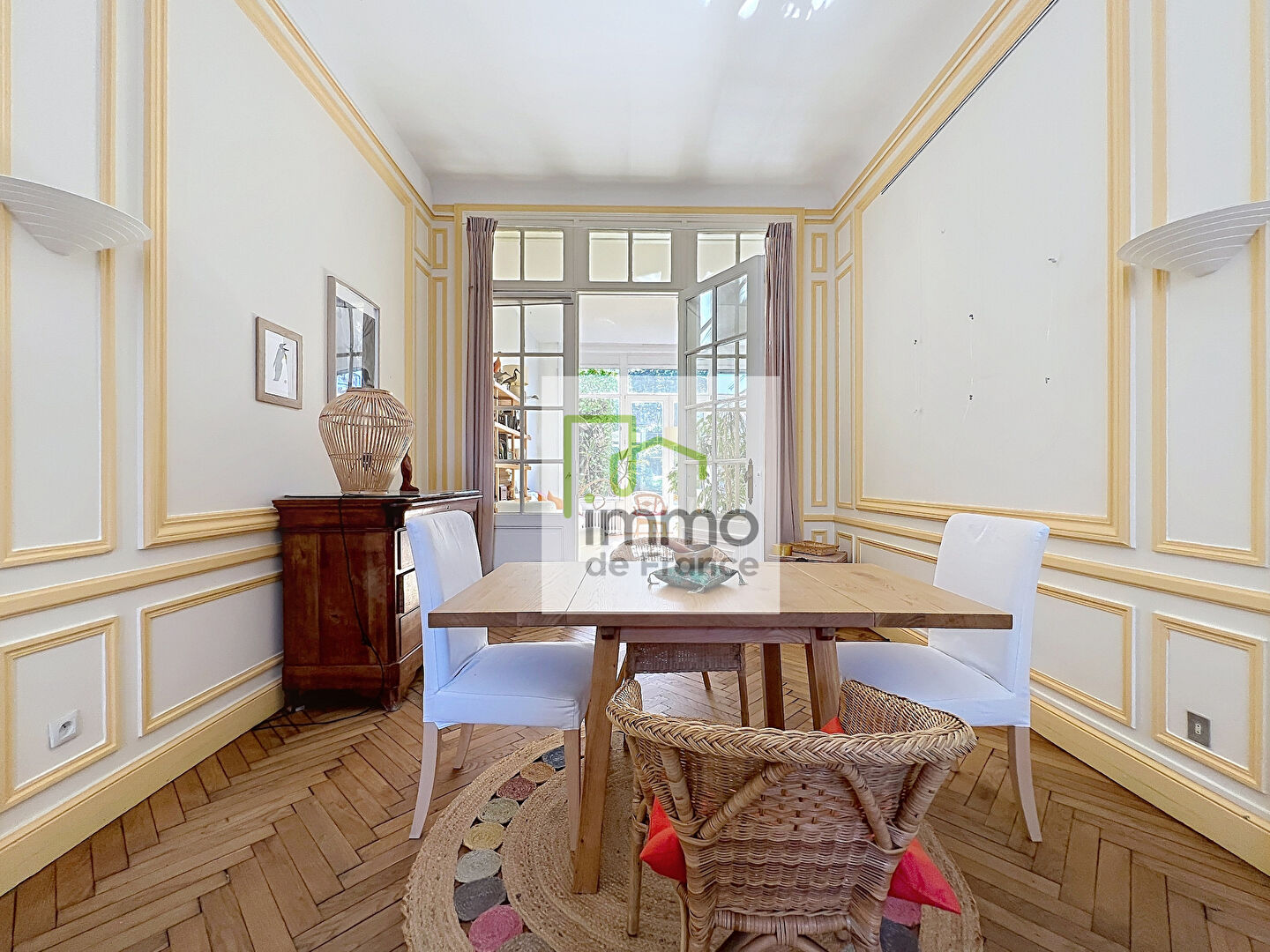 Passé le vaste hall mosaïques, vous disposez un double séjour parquet chêne avec cheminée marbre, une cuisine équipée ouverte sur la salle à manger avec poêle à bois, elle-même ouverte sur une terrasse et jardin intimes. Le premier étage comprend une chambre a...