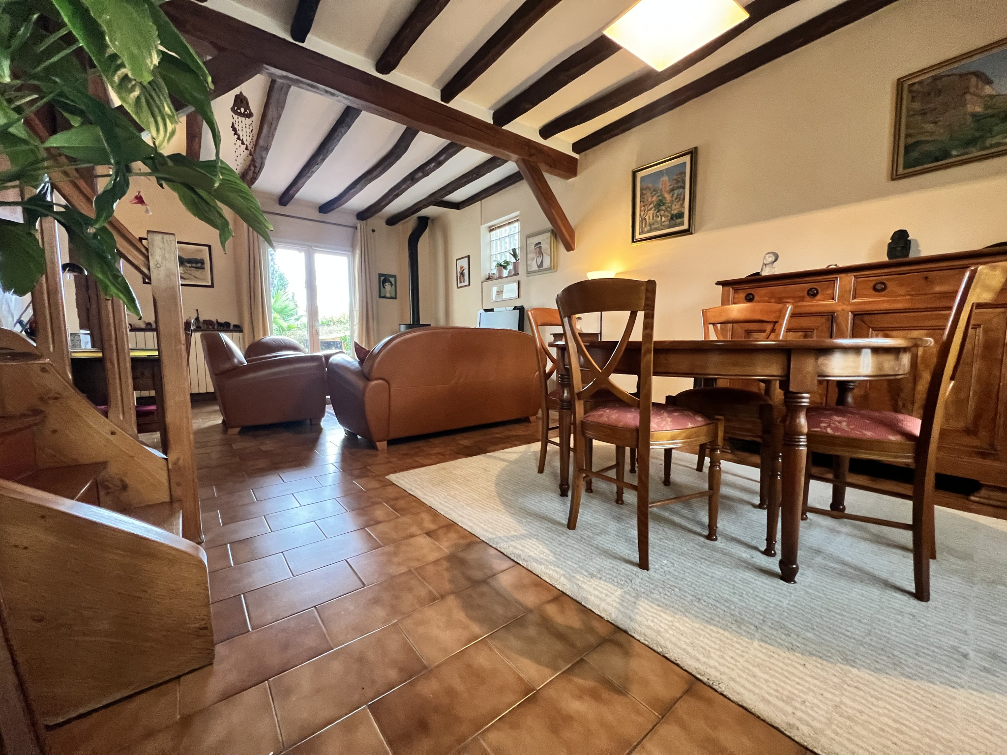 Entrée sur séjour et salle à manger avec Cheminée et accèes jardin, WC, cuisine équipée et salle à manger, garage double.