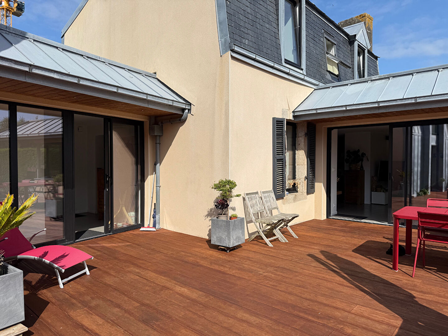 Saint-Pol-de-Léon, au centre ville, propriété entièrement close de murs comprenant maison ancienne entièrement rénovée avec extension contemporaine et dépendance : entrée avec placards, grande pièce de vie ouvrant sur terrasses et jardin, une chambre de plain ...