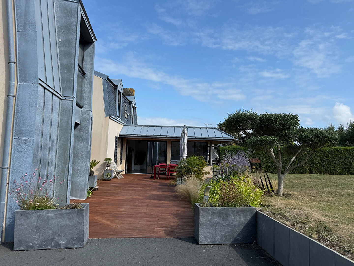 Saint Pol de Léon : Vue mer imprenable, maison contemporaine permettant de vivre de plain pied composée d'une entrée, salon-séjour de 76 m² env. avec cuisine A et E ouverte, accès terrasse et jardin, 4 ch dont 1 au RDC , 2 salles d'eau , 2 WC, buand...