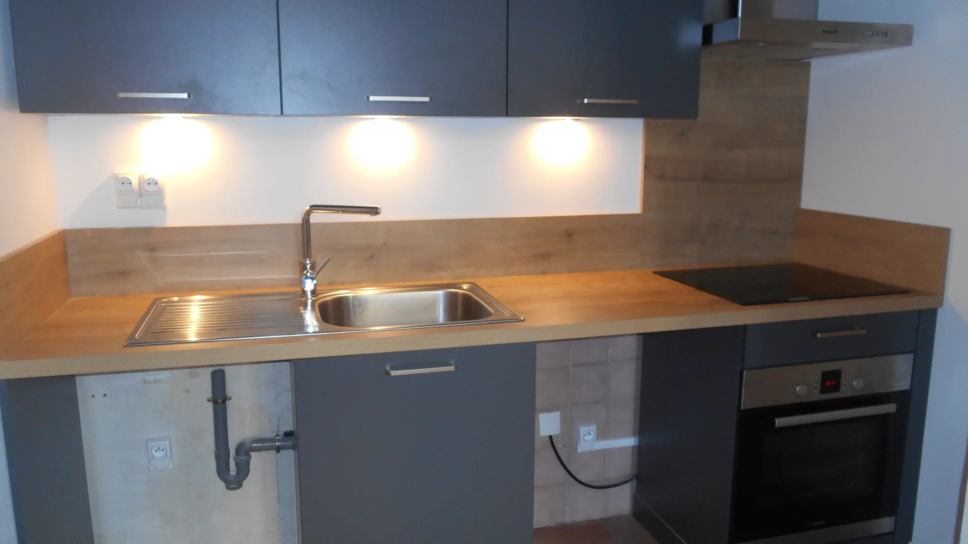 2 pièces au 1er étage composé d'une entrée, un séjour avec cuisine ouverte aménagée avec plaque de cuisson et hotte, 1 chambre avec placards, salle de douche avec wc