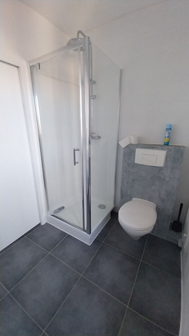 Appartement meublé comprenant une cuisine aménagée et équipée (réfrigérateur-congélateur, micro-onde, plaques de cuisson), une salle de bain avec wc et une pièce principale.