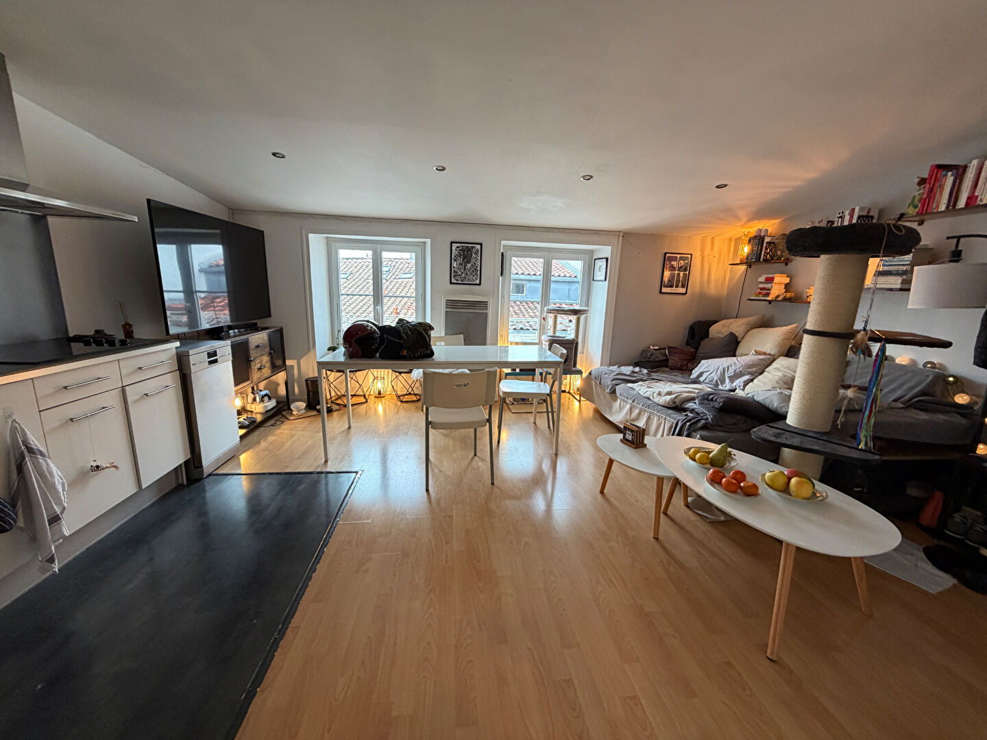 Hyper centre, au 3eme étage d'une petite copropriété, charmant appartement de type T2 non meublé offrant une cuisine aménagée et équipée de plaques gaz, belle pièce de vie lumineuse, chambre séparée, salle de bains avec WC.